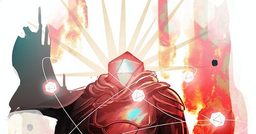 Also, just because I did the research, there’s lots of fun facts. The D10 being the latest dice of the 6 to be invented means it’s perfect for the technological neo. The D20 is the world - even if DIE wasn’t set on a 20-sided sphere, a D20 is close enough to a globe to read as that. As such, it’s the Master’s dice, the GM. The Godbinder’s D12 - apart from the obvious “12 gods in a classic pantheon” thing, also has the interesting fact that it’s isomorphic to the D20. As in, there’s no points in common. So if the D20 represents the material reality, then the D12 being isomorphic seems perfect for the supernatural D12. And so on.